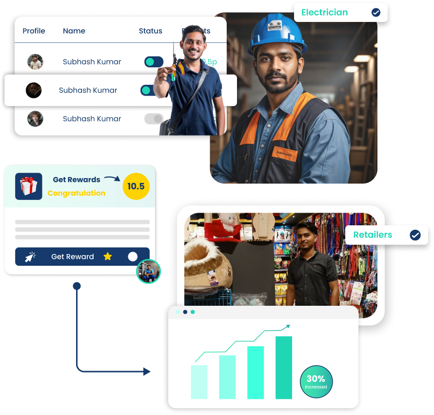 Channelplay designs and manages loyalty programs across the entire channel ecosystem. Our dealer loyalty programs reward counter sales and display compliance, while distributor loyalty programs incentivise volume growth and order consistency. For brands that rely on trade professionals, our influencer growth solutions engage masons, plumbers, electricians, and mechanics through points-based reward systems and recognition. Each program runs on our in-house loyalty platform with multi-language support across 50+ regional languages, a user-friendly mobile app, and a curated reward catalog tailored to the audience.